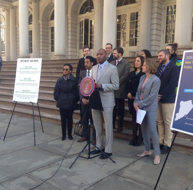 On Thursday, 04.10.14, the New York League of Conservation Voters (NYLCV) held a demonstration on the steps of City Hall calling on Mayor Bill de Blasio, on his 100th day in office, to focus on sustainability and resiliency efforts in his next 100 days. The press conference announced three suggested steps that, if implemented, will better prepare New York City for future climate change and weather-related events. NYLCV President Marcia Bystryn gave the opening remarks and outlined the three milestones that emphasize long-term planning in a post-Sandy New York City: