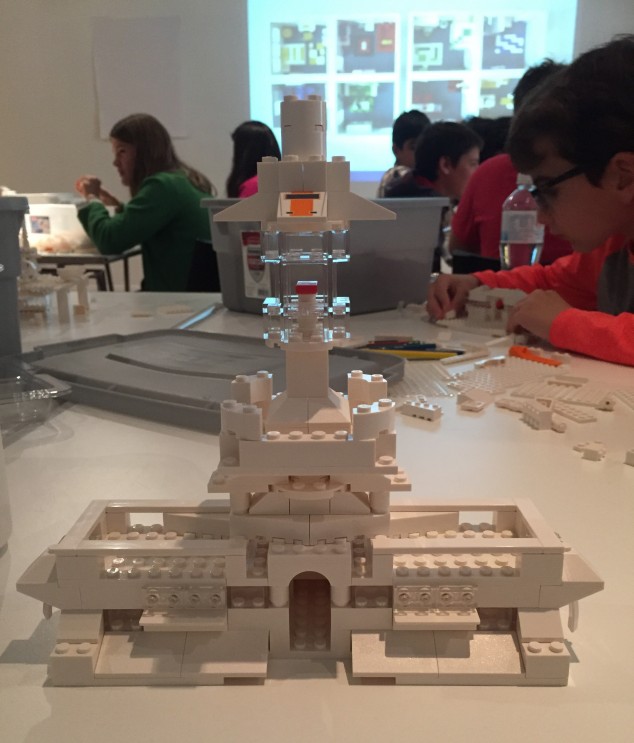 Parents were not invited to the Teen LEGO workshop on 10.25.15, where 30 young designers impressed us all with their creativity and LEGO building skills. Center for Architecture Lead Design Educator Tim Hayduk began the session by presenting examples of real buildings to illustrate architectural concepts such as modularity and symmetry, linking LEGO to real buildings, such as Moshe Safdie’s Habitat and the Villa Rotonda. Students were asked to reflect on their own design thinking and create a building that connected to one of these themes using the LEGO Architecture Studio kit, comprised solely of white and clear pieces.