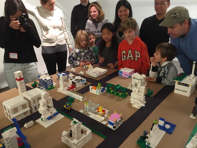 Thanks to a partnership with LEGO this Archtober, the Center for Architecture hosted three sold-out youth and family programs focused on creating architecture with LEGO bricks. At our monthly FamilyDay@theCenter program on 10.17.15, 100 visitors spanning three generations worked together to create a LEGO city. An introductory slide talk got people thinking about the different types of buildings, structures, and spaces that make up a city. Families then got to work creating residential, commercial, industrial, and other types of buildings to populate an empty city map laid out at the back of Tafel Hall. An ample supply of LEGO bricks of all shapes, sizes, and colors fueled their imaginations and the final city boasted bioswales and park benches, a hockey arena, police station, bank, grout factory, floating concert venue, and many more key city components, contributed by both parents and kids.