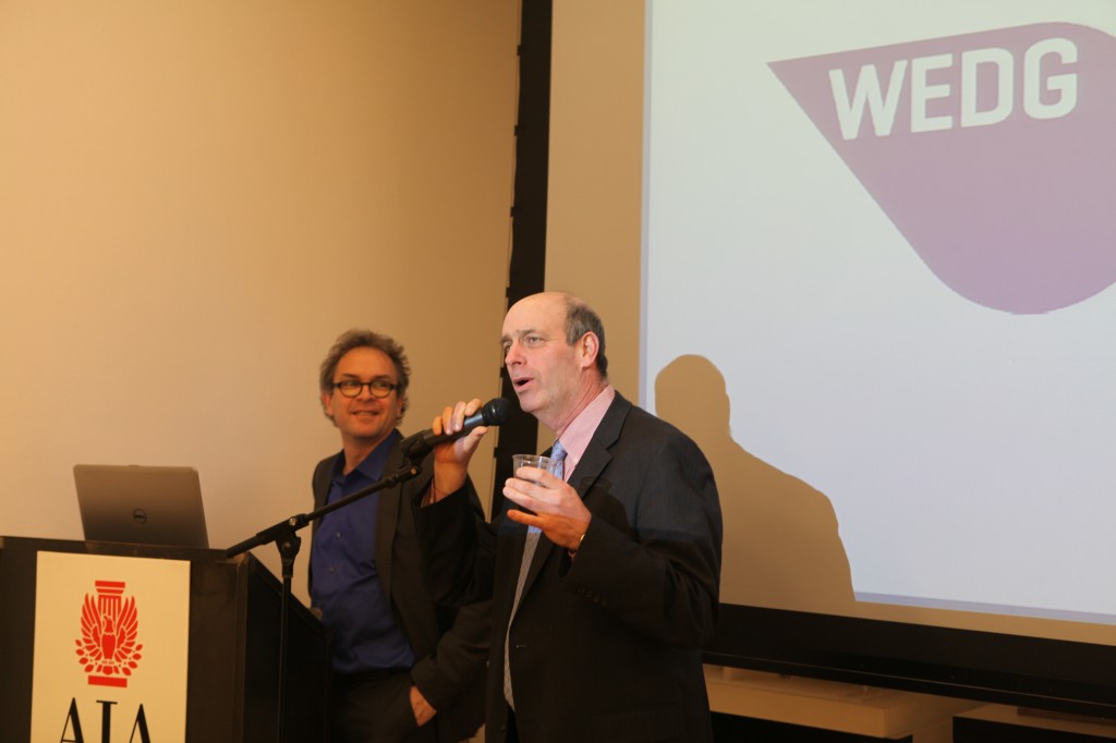 Hurricane Sandy was a wake-up call for New York; in response, the city has been working towards recovery and retrofits to strengthen the 520 miles of the New York City waterfront. Since taking office, Mayor de Blasio has implemented a number of significant sustainability initiatives, including an effort to reduce greenhouses gases by 80% by 2050, Rebuild by Design, and the creation of the Office for Recovery and Resiliency to offset the “enormous cost of inaction,” said Dan Zarrilii, director of Mayors Office of Recovery and Resiliency. Michael Marella, director of the City’s Waterfront and Open Space Planning, also emphasized how we must not “negate all the efforts of the last 20-25 years – [our water is] no longer the open sewer it once was, but one of the great assets of the city.” The WEDG exhibition highlights four waterfront case studies: Domino Sugar Site, Brooklyn Bridge Park, Sunset Park Materials Recovery Facility, and Sandy Hook Pilots Association Headquarters, each leading examples for resilient waterfront design, nominated for features such as blue-green landscaping, recycled materials, stormwater management, and public access.