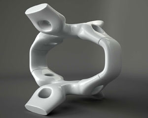 The works on view are linked by their shared, formal exploration of objects subjected to speed and movement, such as auto bodies or aerospace prototypes. Here, Asymptote founder Hani Rashid returns to geometric forms called Motionscapes (or M-Scapes), initially produced in 2001 as digital drawings and exhibited at the ICA Philadelphia. Iterations of the M-Scape form are consistently used as building blocks for Asymptote’s larger concepts and are described by Rashid as “ambiguous bodies caught between the automotive body and the anatomical body.” This is the first time M-Scapes have been produced as physical objects for exhibition.