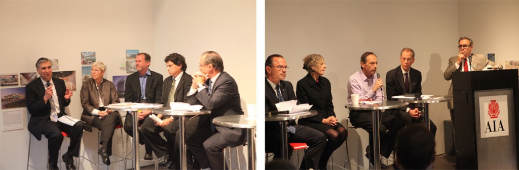 The Mayor’s Obesity Task Force Panel brought together representatives from nine city agencies, including Commissioners David Burney, FAIA (DDC; bottom photo, speaking), Thomas Farley, M.D., M.P.H. (DOHMH; bottom photo, right of Burney), Adrian Benepe (Parks; bottom photos, far left), and Edna Wells Handy (DCAS; middle photo, speaking).