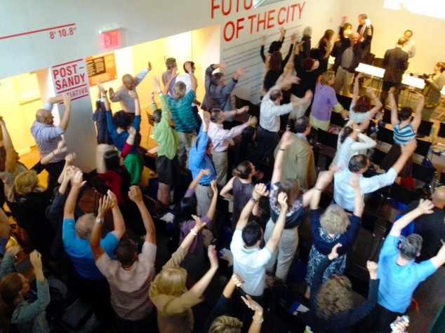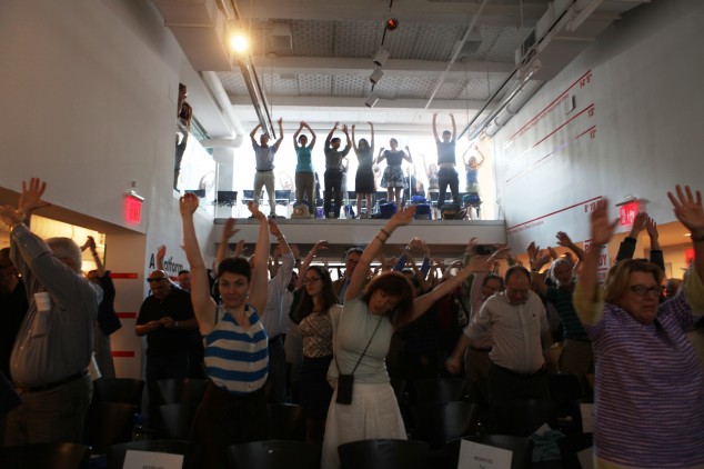 This wasn’t quite the case: the attendees were following Dr. Karen K. Lee’s recommendation of “active applause,” standing up for each applaudable moment: along with exercises led by the Department of Health’s Sarah Wolf, MPH, RD, and group yoga maneuvers led by Robyne Kassen, Assoc. AIA, and Sarah Gluck of Urban Movement Design, one of several strategies for keeping the blood circulating and staving off the languor that all-day meetings often produce. But Fit City is that kind of event: it translates ideas directly into practice.