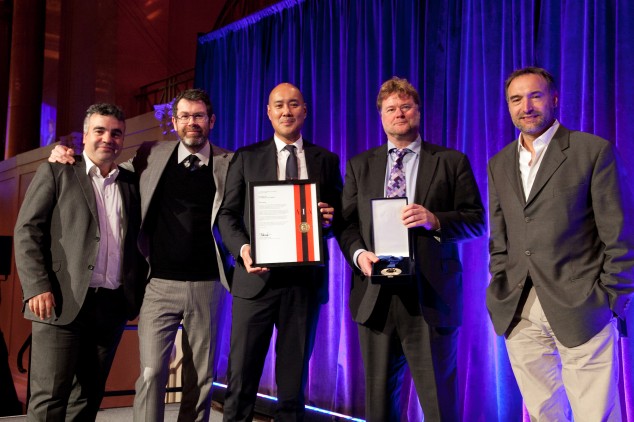 The final award was the AIANY Medal of Honor. Conferred by the Chapter since 1914, the medal recognizes an architect or firm for distinguished work and high professional standing. This year’s recipient was Grimshaw Architects. Accepting the award on the firm’s behalf was partner Andrew Whalley, AIA, RIBA, who traced the firm’s history in New York in relation to its commitment to architecture and design in the service of its users. Grimshaw has been involved in projects, both small and large, including a 20-year effort by the city to refresh its street furniture. According to Whalley, “I knew we’d arrived when Mayor Bloomberg drew particular attention to the public toilets, saying ‘New Yorkers have had their legs crossed for over 20 years.’”