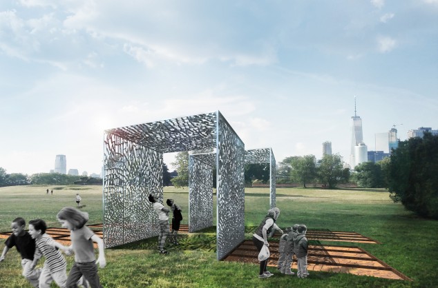 Cast & Place, designed by Team Aesop, has been selected the winner of the seventh annual City of Dreams Pavilion Competition. The temporary installation, which will be constructed on Governors Island this summer, re-imagines waste as a transformative resource. Soil dredged from the East River, the material also used in the construction of Governors Island, is laid out to dry and crack. Approximately 250,000 aluminum cans are melted down and poured into the cracked dredge. The results are light, strong panels that provide structure and shade, assembled into spaces for performance and play. Rain-soaked reflecting pools of dredge reveal the pavilion’s formwork as they dry and crack in the summer heat, inducing meditations on time, materiality, and the sources of our city. The annual competition is hosted by FIGMENT, the AIANY Emerging New York Architects Committee (ENYA), and the Structural Engineers Association of New York (SEAoNY). The City of Dreams Pavilion, so named for its focus on the future of a world that faces strains on both economic and natural resources, promotes sustainability-oriented thinking amidst the architecture and design communities, requiring designers to consider the environmental impact of their designs in everything from materials sourcing to disposal, or ideally reuse, of waste at the end of the season. Over 100 design proposals were reviewed and five finalists were short-listed. Team Aesop will work with Governors Island to select the exact site for Cast & Place, refine the design, obtain necessary approvals, and fabricate and install the pavilion on the island. Note: Help fund the project or volunteer by contacting castandplacevolunteer@gmail.com.