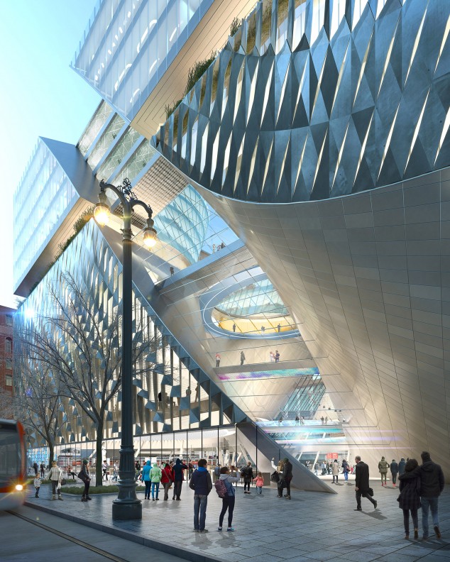 SHoP Architects is collaborating with Detroit based-Hamilton Anderson Associates on the design of a 52-story, 1.2 million-square-foot mixed-use development that, when completed, will become Detroit’s tallest building. Located on a two-acre site where the J.L. Hudson’s Department Store once stood, the project will be among the largest construction projects in Detroit in decades. At its center is an enclosed community civic space that opens to welcome residents and visitors from surrounding streets. Retail, residential, food, and culture amenities will provide everyday services now lacking for the influx of residents that continue to relocate downtown. The project consists of a nine-story podium and a residential tower with 250 residential units, plus 700 parking space below ground. In 2013, SHoP was selected after an invited competition to study the possibilities for using the site in downtown Detroit as a catalyst for the ongoing revitalization of the city. Detroit’s Downtown Development Authority has approved a timeline that sets the groundbreaking for the development to this coming December.