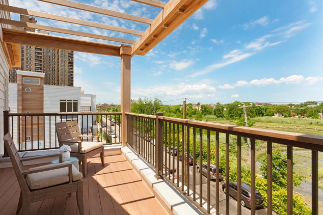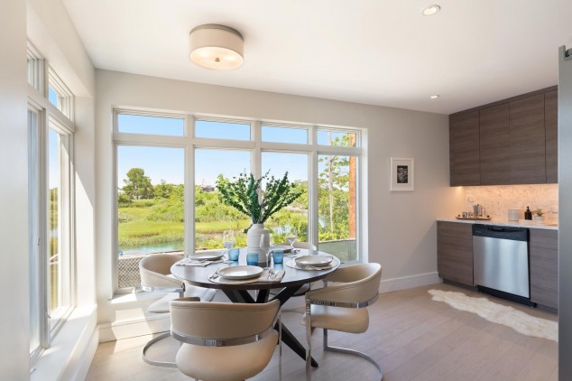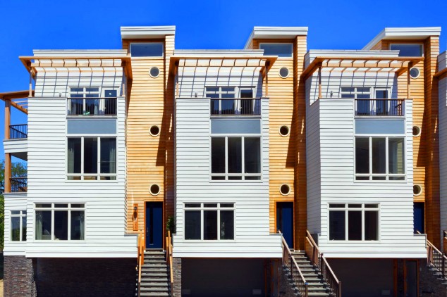 Saltmeadow, designed by CetraRuddy Architecture is a new rental beachfront community in the Far Rockaway section of Queens. Bound by Beach 5th and Beach 6th Streets between Seagirt Boulevard and Reynolds Channel, which spills into the Atlantic Ocean, the new development consists of 60 units in four clusters of two-family townhouse buildings consisting of two-and-three-bedrooms. The ground-floor façades of the buildings are clad in a stone base of quartzite and sedimentary rock, which echo the jetties along the Rockaway shoreline. Locally-quarried bluestone slabs are used in accent trims and the entry stairs. Accent walls of beveled Western red cedar planks and weathered zinc light fixtures provide additional warmth at the townhouse entries. Taking advantage of its waterfront location, all units have outdoor space and windows oriented to maximize water views. Set within the flood zone affected by Superstorm Sandy in 2012, the project was designed to withstand flooding and allows residents to rebound from future extreme events. All habitable spaces and electrical closets are built above the base flood elevation, while ground floors are laid out as storage, garage and unfinished areas. In addition, the design features flood vents, permanent openings that allow water to pass into or out of a building’s exterior foundation walls. Other sustainable features include white roofs, permeable pavers to reduce runoff, and storm planters that capture roof runoff and filter it before releasing it back into the soil. The project is developed by JDS Development Group.