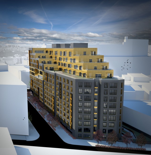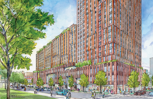 Ground was recently broken for Martin Luther King Plaza, a 13-story, 176,000-square-foot affordable residential building designed by Magnusson Architecture and Planning. Located in the Mott Haven section of the Bronx on a site formerly zoned for manufacturing, the residential building was designed at market rate standards and is the first example of the successful application of the City’s new Zoning for Quality and Affordability regulations. The 167-unit building contains a mix of studios to three-bedroom apartments, of which 67 will be allocated for low-income tenants and 33 are for formerly homeless families. Tenants will have access to amenity spaces including a landscaped rear garden, recreation and community rooms, and a gym with an adjacent outdoor terrace. Developed by Radson Development, the project is expected to achieve LEED Gold certification. The project is financed under the NYC Department of Housing Preservation and Development (HPD) and the NYC Housing Development Corporation’s (HDC) Extremely Low and Low-Income Affordability Program (ELLA) and HPD’s Our Space Initiative, MLK Plaza is also one of the first projects to be financed under the City’s Mandatory Inclusionary Housing (MIH) program. MLK Plaza is part of a boom-let of development currently taking place in the Bronx; local elected officials stress they will ensure that public land continues to be available for their constituents.