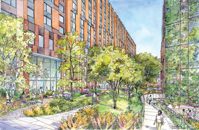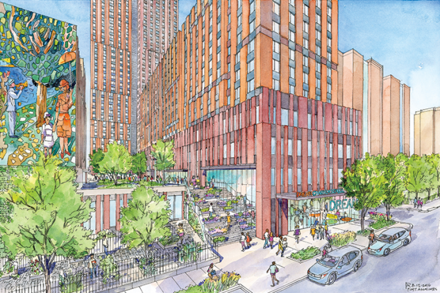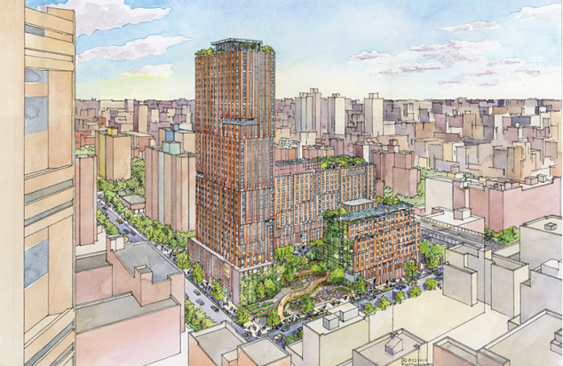 has designed Sendero Verde (“Green Pathway”), the country’s largest passive house project. The 751,000-square-foot, mixed-use project contains 655 designated affordable residential units ranging from one- to three-bedrooms. Per Mandatory Inclusionary Housing (MIH) rules, 163 of the apartments will be permanently affordable. Taking a cue from an historical trail that once wound through the site, the project is arranged around a central meandering landscaped path, weaving through the project from Park Avenue to the western end of 111th Street and Madison Avenue. The massing is broken down into three separate volumes ranging from ten to 37 stories, which frame this path, forming a central courtyard. This courtyard spills out onto different levels, creating opportunities for individual community gardens. The project also includes extensive community space, retail space, and outdoor gardens, including an 85,000-square-foot Harlem RBI/Dream Charter School, a Union Settlement Community Space, 11,000 square feet for the Union Settlement, a 29,000-square-foot new YMCA facility, a 26,000-square-foot Mount Sinai East Harlem Community Health Center, and a fresh foods grocery store. The development team, Jonathan Rose Companies and L+M Development Partners, in partnership with Handel Architects and DLANDstudio Architecture + Landscape Architecture, submitted the winning proposal to the SustaiNYC Competition and were awarded the project in February. This city-block-sized development also advances the goals of Mayor de Blasio’s One City: Built to Last program, which set out to reduce energy use in the city. The project is expected to be completed in 2019.