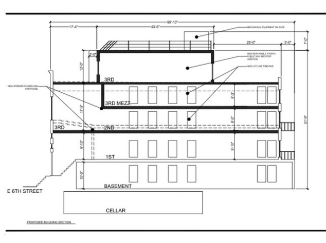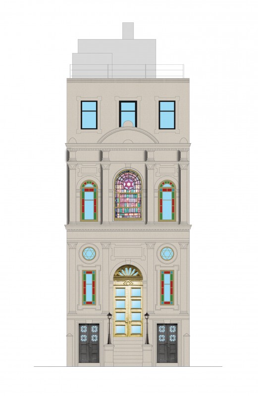 Joseph Pell Lombardi Architect has designed a way to adapt the cash-poor and in desperate need of repairs Congregation Mezritch Synagogue for residential use while maintaining a house of worship on the ground floor. A classical Italian Renaissance-style building located at 415 E. Sixth Street in the newly designated Lower East Side/East Village Historic District, the synagogue was originally a dwelling which was repurposed in 1910 by architect Herman Horenburger. The new scheme proposes converting the upper floors of the three-story building into three residences with a new one-story set-back penthouse on the roof. The firm placed a series of poles and orange netting on top of the building to show that the penthouse would not affect its appearance as seen from the street, in accordance with the historic district guidelines. In addition, the building is to be completely upgraded with all new mechanical, electrical, and plumbing systems, and the entire façade will be restored. The project is being developed by East River Partners, which signed a 99-year lease with the congregation and will be responsible for the upgrade to the worship space. The proposal is set to go before the Landmarks Preservation Commission on 04.09.13.