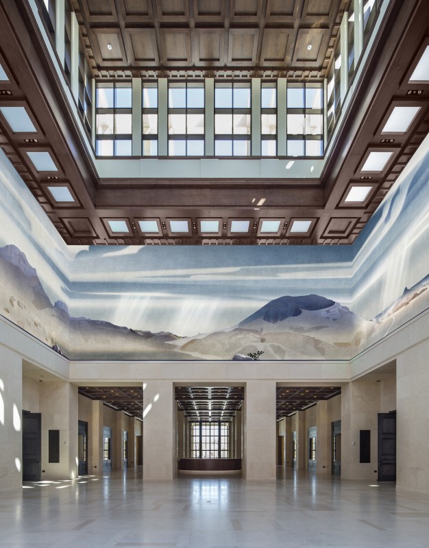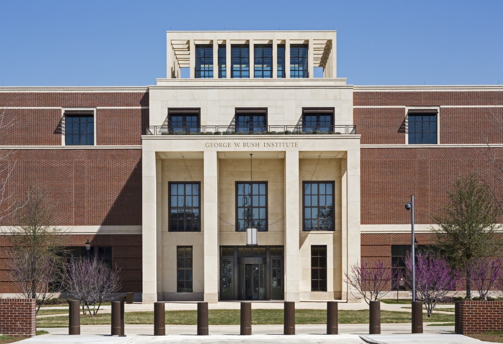 The 226,560-square-foot George W. Bush Presidential Center on the campus of Southern Methodist University in Dallas recently opened. Designed by Robert A. M. Stern Architects, the brick-and-Texas Cordova Cream limestone building complements the historic American Georgian character of the campus. The center houses the presidential library and museum, along with the George W. Bush Institute. Its lobby leads to the archives in the building’s east wing where classrooms, research rooms for visiting scholars, and offices for the National Archives and Records Administration; the museum is entered through the lobby’s southern end. The museum’s central orientation point is Freedom Hall, which is topped by a 67-foot-high, 50-by-50-foot Texas Cordova Cream limestone lantern that brings daylight into the heart of the building and, at night, forms a glowing beacon. Twenty feet above the hall, a 20-foot high, 360-degree high-definition LED media display introduces visitors to the museum’s public exhibition galleries, which include a full-scale replica of the Oval Office and a Texas rose garden modeled on the White House’s Rose Garden. Wrapping the south side of the building, the institute wing includes a 360-seat auditorium as well as seminar, meeting, and reception rooms and terraces. The Center, designed to achieve LEED Platinum, is set in a 15-acre urban park designed by Michael Van Valkenburgh Associates.