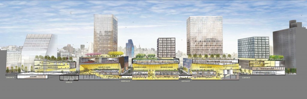 A comprehensive plan to build new affordable housing, along with retail, office, community, and cultural spaces, on a large swath of undeveloped land consisting of nine city-owned lots in the six-acre Seward Park Urban Renewal Area (SPURA) on the Lower East Side, was recently announced by Mayor Bloomberg. Called Essex Crossing, the 1.65-million-square-foot project, designed by SHoP Architects and Beyer Blinder Belle, is anchored by 1,000 units of housing, half of which will be permanently affordable for low-, moderate-, and middle-income households and senior citizens. The plan includes a 15,000-square-foot open space, a dual-generation school operated by the Educational Alliance, a community center run by Grand Street Settlement, a rooftop urban farm, the Andy Warhol Museum, plus 250,000 square feet of office space and a diverse mix of retail space. In addition, the Essex Street Market will relocate across Delancey Street, enabling it to double in size to approximately 30,000 square feet on the ground floor plus around 7,000 square feet on the mezzanine. It will feature the Market Line on a concourse created through vaulted archways. In 1967, the city demolished a series of public housing buildings and several attempts to develop the area failed. The project represents $1.1 billion of investment by Delancey Street Associates LLC, a joint venture comprised of L+M Development Partners, BFC Partners, and Taconic Investment Partners, and will create approximately 1,600 permanent jobs and 4,400 construction jobs. It grew out of a collaboration between community stakeholders, local grassroots leadership, and elected officials working in partnership with city agencies over the past five years. The anticipated groundbreaking is spring 2015.