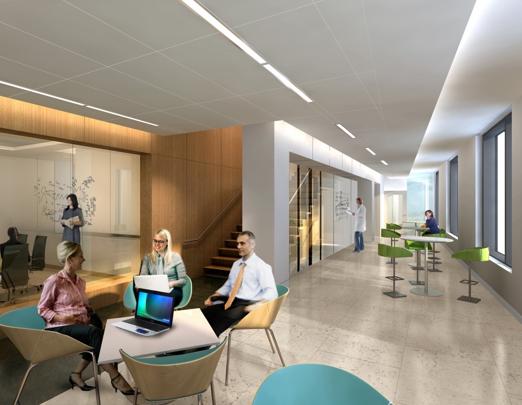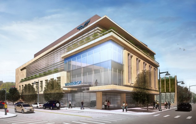 The new 95,000-square-foot Winthrop-University Hospital Research and Academic Center, designed by Perkins Eastman, recently topped-out. Located near the Long Island Railroad Transit Hub in Mineola on Long Island, the building is angled off the street grid, which enhances its solar efficiency. Roof gardens visible from the bridge over the train tracks help control rainwater runoff and summer heat island effects, and provide a view and a place of respite for building occupants. The five-story translational research and academic facility is designed to foster research in the treatment and prevention of pediatric and adult diabetes in collaboration with patient care and community education. The facility enables information to move from the research environment directly to caregivers and patients, and to promote chance encounters between diverse researchers to help further ideas and inspire breakthroughs. To that end, open, flexible laboratories connect to the clinical research and patient care environments through communal spaces. A large open circulation stair, infused with small conversation zones, connects the ground-floor education and community outreach functions with the upper floors, while visibly promoting the interactive and health-oriented mission of the environment.