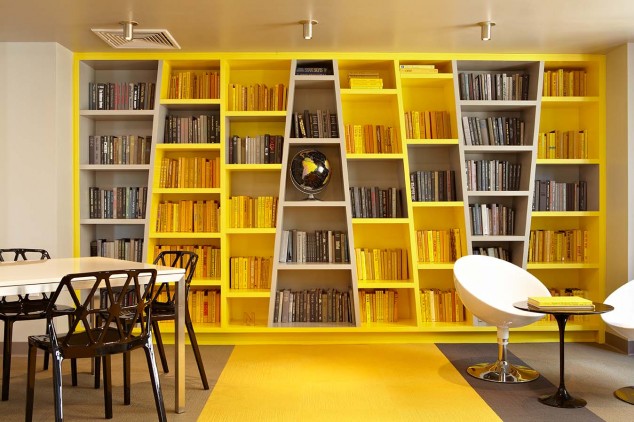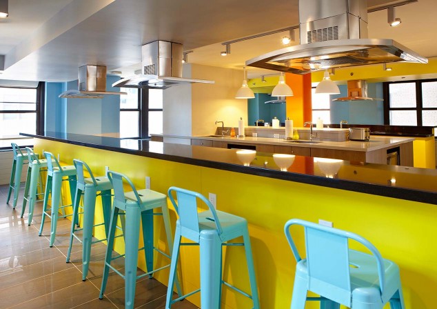 Answering the call for more student housing in Manhattan, Educational Housing Services (EHS), a not-for-profit organization that provides off-campus housing in New York City for college students and interns, leased five floors of the New Yorker Hotel at Eighth Avenue and 34th Street and recently expanded to the sixth. The new 24,000-square-foot space has been renovated by Wid Chapman Architects, transforming hotel rooms into dorm rooms and creating a student commons to be used by all of the residents. The design intent of the commons was to replace small, isolated satellite cooking facilities and lounges previously interspersed among the dorm rooms with large, vibrant, spaces complete with cooking, dining, library, recreation, and film screening areas. The firm collaborated with artist and Pratt Institute adjunct professor Christopher Wynter to create a customized motif on lounge columns clad with reclaimed wood. The project features printed geometric wall graphics that wrap the public corridors, custom-frosted glass decals that mimic both the wall covering and the artist’s wood painting motifs, and angled MDF shelving. In 2010, the firm completed the renovation at EHS’s St. George Hotel facility in Brooklyn Heights.