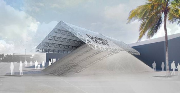 formlessfinder has been selected to design the pavilion for Design Miami 2013, which serves as an entrance, public lounge, and meeting place for fair-goers and residents of South Beach. Called “Tent Pile,” the 2,900-square-foot project is inspired by Miami’s “postwar tropical Modernism,” a style that unites the interior with the exterior. Composed of approximately 500 tons of sand (this being Florida, a zero-waste material), which forms a pyramid. Balanced at the apex is an anodized, lightweight aluminum roof. The architects enlisted the support of Alcoa and Goleta, CA-based aluminum fabricator Neal Feay Company for the design and fabrication of the roof and custom seating. The sand has a thermal mass cooling effect: metal fins driving through the retaining wall into the sand draws the cool temperature into the seating area and simple fans create a breeze that ripples out from the wall. formlessfinder, a winner of AIANY’s New Practices New York competition in 2012, will head down to Miami in mid-November to supervise the construction.