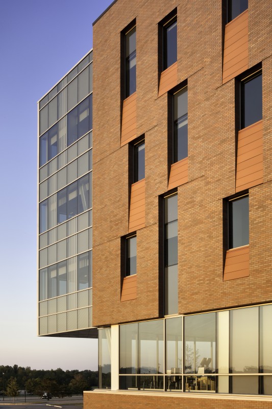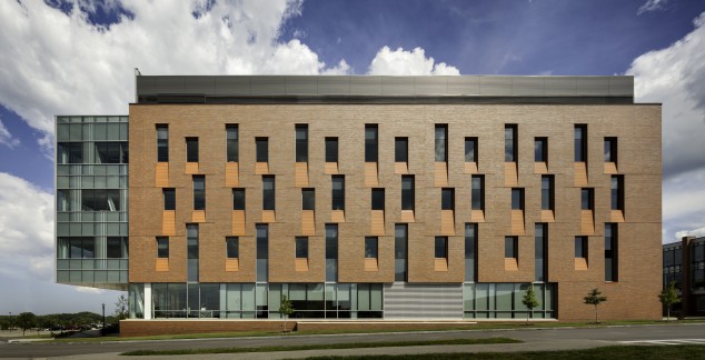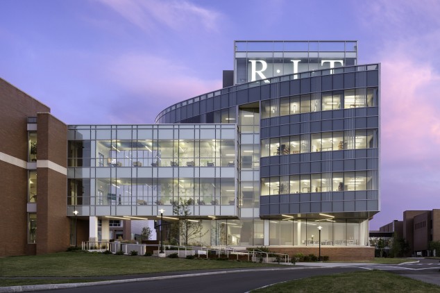 Institute Hall, Rochester Institute of Technology’s (RIT) new science facility designed by Francis Cauffman, recently marked its official opening. The 78,000-square-foot, $26 million research building, which completes the campus’s new science quad, houses the school’s new chemical and biomedical engineering departments. Located on a campus that consists predominantly of brick-clad Modernist buildings, more recent additions to the campus have diversified the architecture, while still incorporating the traditional brick colors. Institute Hall has a transparent, glazed core that is wrapped in a red brick shell, with a traditional rectangular brick wall on its west face and a curved glass façade on its north face. The brick sections house labs, while the glass encloses offices and classrooms, allowing daylight in. The project features a dozen 750-square-foot faculty research labs, a 2,500-square-foot chemical engineering unit operations teaching lab, a vivarium, classrooms for training healthcare professionals, an environmentally-controlled laser research lab, a café, a rain garden, and a study space located in an elevated bridge that connects Institute Hall with an adjoining building. Francis Cauffman designed the building’s core, shell, and labs in addition to planning the classrooms. The architect-of-record, Rochester-based Bergmann Associates, designed the building’s interiors. The project is designed to receive LEED Gold Certification.