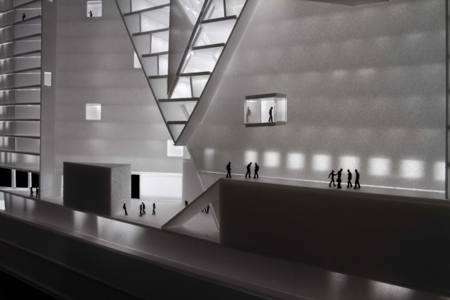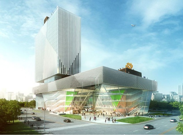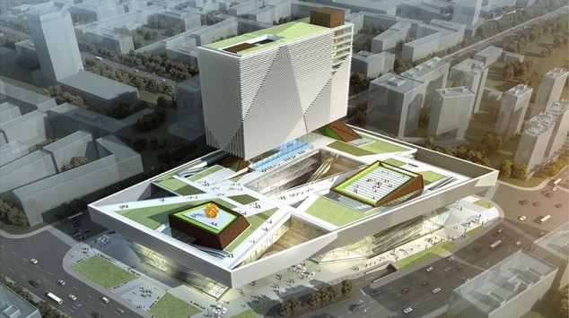 Joel Sanders Architect and FreelandBuck won first prize in an invited competition to design the Kushnan Phoenix Cultural Mall in Nanjing, China. The 861,000-square-foot project will house the corporate headquarters for Phoenix Publishing (PPMG), one of the largest media and publishing companies in China, and a cultural complex. The project includes a 20-story office tower, clad with a pattern of diagonal louvers that provide solar shading, perched upon a five-story podium organized around four “cultural cores” that respectively house theaters, exhibition halls, a fitness club, and an education center. A retail loop, comprised of affiliated stores, restaurants, and cafes, spirals around each cultural core. The large urban site is divided into four pedestrian-scaled culture/commerce blocks that define the perimeter of a central outdoor atrium. The book mart crowns the entire complex and serves as a base for the PPMG office tower, visually and symbolically unifying all of the programmatic elements. The green roof of the book mart acts as a cultural park where the general public and PPMG employees can congregate. The park is accessible from within each of the four mini-malls, as well as from a grand escalator located in the outdoor central atrium. The pinnacle of each mini-mall intersects the book mart and pierces the green roof forming three pavilions – kunsthalle, amphitheater, and spa. Integrated sustainable systems determine optimal efficiency, lifecycle cost, and environmental performance. The result will be an urban development that embodies a cost-effective design outcome of lasting significance, with operational efficiencies that could result in a net-zero energy, water-positive, and zero-waste building. The project is anticipated to be completed in 2016.