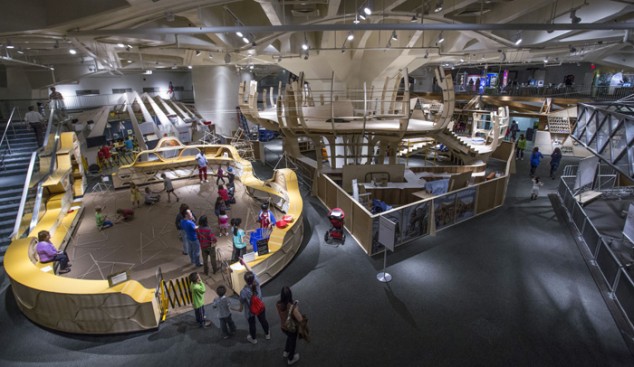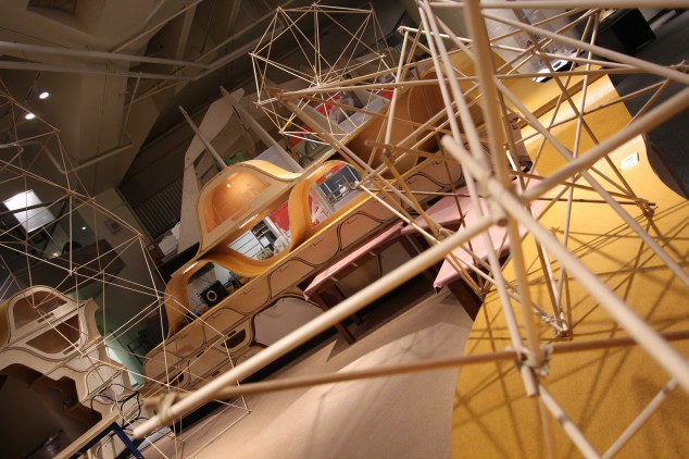 “Design Lab,” a new, permanent exhibition is set to open on 06.07.14 at the New York Hall of Science (NYSCI) in Flushing Meadows, Queens. Located in the lower level of the central pavilion of the museum, whose original structure was designed by Wallace K. Harrison for the 1964-65 World’s Fair, the exhibition encourages museum-goers to be creative while experimenting with structures, circuits, and simple materials, and collaborating with others. Designed and fabricated by Brooklyn-based SITU Studios, the 10,000-square-foot exhibition space consists of five visually and thematically different activity areas. Maker Space, which opened in 2012, shows visitors how to use tools that convert design ideas into prototypes. Backstage is where visitors devise solutions to performance-based activities such as making jointed shadow puppets out of index cards, fasteners, sticks, and tape. In Sandbox, visitors can build and stand inside sturdy structures, such as a large structure made out of wooden dowels and rubber bands. Studio is a space where visitors build small, tabletop structures and add their creation to a collaborative project; one challenge will be to build a structure out of cardboard, circuits, and pipe cleaners. Treehouse is a split-level area for experiments and activities requiring a vertical drop. The first activity to be featured in this space will have museum-goers use pulleys, zip lines, and other items to devise methods to move objects between the two levels.