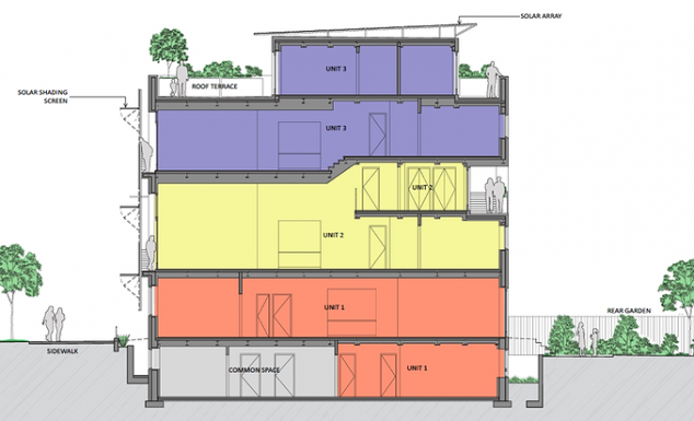 The R-951 Residence, designed by Paul Castrucci Architect, is currently under construction on a narrow site in the Prospect Heights section of Brooklyn. Named for resilience and its address on Pacific Street, the three-family residence is expected to earn the appellation of the first net-zero, solar-powered passive house condominium in the area. Each of the three 1,500-square-foot residences has its own 4 KW solar photovoltaic system; the building also features solar screen shades, triple-glazed windows, an airtight building envelope, an energy recovery ventilation system and heat pumps, and a 1,200-gallon rainwater collection system to irrigate the greenery. The first-floor unit includes a backyard and half of the basement – the rest being common space for the three households. The second floor includes a small balcony in the front and a larger one in the rear, and a loft bedroom. In addition to the front balcony, the top-floor duplex features front and rear rooftop terraces.