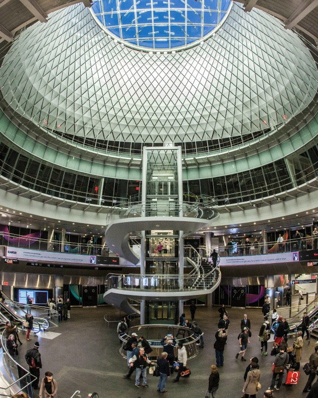 The Fulton Center, New York City’s newest transit hub, is now open to the public, and 300,000 daily transit passengers are expected to make use of it. In 2003, Grimshaw was appointed by the Metropolitan Transportation Authority (MTA) Capital Construction Company as lead architect in collaboration with design consultant Arup, to design a light-filled civic space with the ambience and activity of Grand Central Station. The hub is organized around a large-scale atrium behind a transparent façade. Tapered steel columns draw inspiration from the historic neighborhood’s cast-iron buildings, and complement the integration and restoration of the adjacent Corbin Building. The open design provides unimpeded pedestrian movement and sightlines across a level ground plane extending from the major thoroughfares of Broadway and Fulton Street. Carefully aligned entrances and exits allow the streetscape to permeate the building, defining clear and efficient pathways to all trains. The transit hub’s atrium ascends to 120-feet and is topped by a conical dome centered on the concourse below. The dome is truncated by an angled glass oculus oriented to the southern sky. Called “Sky Reflector-Net” and completed in 2013, it is a collaboration between Arup, Grimshaw, and James Carpenter Design Associates, and was commissioned by the MTA Arts for Transit and Urban Design and MTA Capital Construction Company. Held aloft below the oculus, the artwork paints an ever-changing image of the sky across the atrium interior. The $1.4 billion center was funded in part, with $847 million from a special Congressional appropriation granted after 9/11. Known as the Lower Manhattan Recovery Grants, the funds were intended for local transit agencies to repair, replace, and enhance transportation infrastructure in Lower Manhattan.