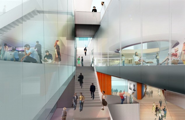 Diller Scofidio + Renfro is designing the new 100,000-square-foot Burt & Deedee McMurtry Building to house Stanford University’s Department of Art and Art History and the school’s Art and Art History Library, bringing the study of art to be under one roof. The building takes the form of two interlocking strands, allowing the art practice and art studies programs to retain separate identities while simultaneously connecting with one another. The art history strand has a cement plaster exterior, a traditional material on the Stanford campus. The art-making strand is both industrial and contemporary in appearance, with a custom patina finish. Occupying the building’s first floor is a 125-seat flexible presentation space that serves as a classroom, performance space with acoustical walls, or a gallery for presenting work in various media, alongside a sculpture studio and dedicated screening rooms. The building’s glass door rolls open for outdoor performances, or closes to accommodate projection for lectures as well as exhibition displays. Transparent studio and classroom walls will create encounters with art throughout, while also allowing abundant natural light into the space. Faculty offices will be located on the third floor, while the building’s lower level will house extensive photography darkrooms, computer art labs, and film editing rooms. The Art and Architecture Library, which suggests a floating glass box on the building’s middle floor, functions as the intersection point between the two strands, and offers views of every floor through a central glass oculus. Portland-based Boora Architects serves as executive architect. The building is scheduled to open in Fall 2015.