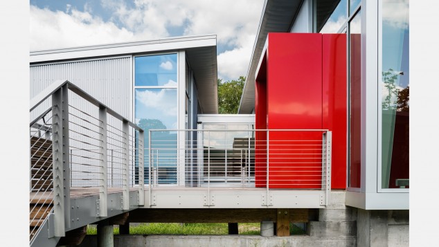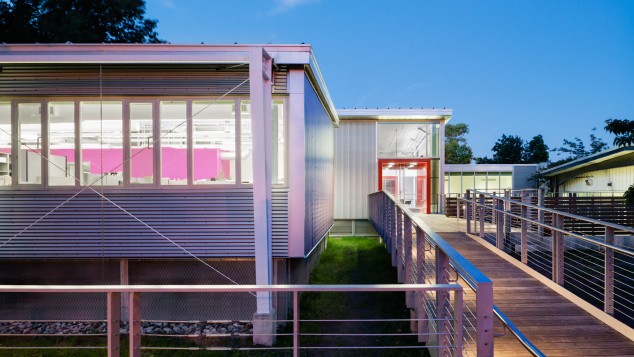 BKSK Architects has completed Phase 1 of the two-part renovation and expansion of the Olmsted Center in Flushing Meadows-Corona Park in Queens, a one-story modular building originally designed by Skidmore, Owings & Merrill for the 1964-65 World’s Fair Corporation’s administrative offices, and now the headquarters for several divisions of the NYC Parks and Recreation Department. Located in a flood-prone area, Phase I of the 60,000-square-foot project includes a 10,000-square-foot annex, raised to a height above the flood plain, whose exposed steel exterior echoes that of the existing structure; inside are several new offices, a new public procurement /bidding room, and other new meeting rooms. Phase 2, which is scheduled to begin in 2015, focuses on exterior renovations and energy retrofits of the existing structure, which sits four feet below the FEMA 100-year flood plain. A network of water features, including wetland retention areas and a raised water channel system, will improve flood mitigation for the entire site. The project is designed to achieve LEED Gold certification.