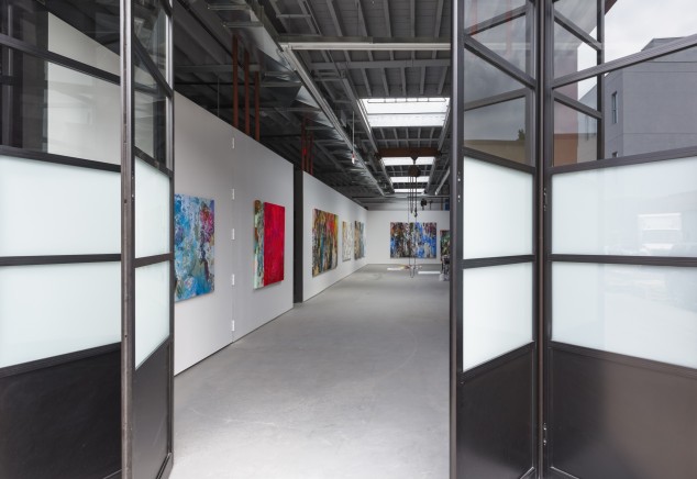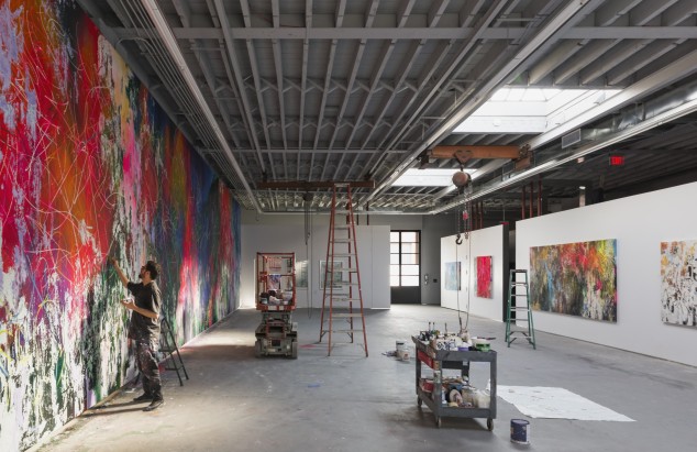 Last summer, Cuban-American artist José Parlá worked with Snøhetta to renovate a warehouse in the Gowanus section of Brooklyn and convert it into a working artist’s studio. Post-renovation, the building still retains the aesthetics of its working past with its industrial ceilings and concrete floors. Existing skylights and windows were re-opened to bring in natural light, and the garage door was widened for accessibility. The interiors are painted in neutral grey tones so that the vibrant colors of Parlá’s paintings stand out within the work space. The 5,000-square-foot space contains two main areas. A pair of interlocking, U-shaped wall systems create the studio’s “arena,” which is the artist’s main work area with ample space to exhibit current pieces. Pivoting walls provide flexibility to accommodate large-scale murals, such as the recently-completed 90-by-15-foot ONE: Union of the Senses, created specifically for the main lobby of 1 World Trade Center. A cozy area called the “nest” on the mezzanine is a relaxing space for the artist to view his paintings from a different perspective. The design of this studio is one in a series of collaborations with Snøhetta, including the integrated artwork for the façade of the Far Rockaway Public Library in Queens, and Nature of Language, a mural completed last year for the Hunt Library at North Carolina State University.