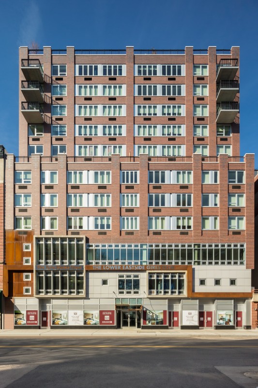 CTA Architects (formerly Cutsogeorge Tooman & Allen Architects) designed a 90,000-square-foot, 12-story, mixed-use building on Avenue D between 7th and 8th Streets. Formerly a vacant lot, the site is now brimming with activity taking place at the Lower Eastside Girls Club for Community, which occupies the first three floors. A new addition to the project is a 1958 Airstream trailer that’s prominently displayed in a second-story window. The 140-square-foot trailer has been repurposed by Walters Storyk Design Group to serve as a teaching, recording, and broadcast production studio for the club’s WGRL Internet Radio Station and Recording Arts Program. The space outside the trailer is a combination classroom/live performance stage. The design of the interiors was guided by Lyn Pentecost, co-founder of the Lower Eastside Girls Club of New York, who studied architecture and design at Cooper Union. There is a multi-purpose facility for healthcare and physical activities, a technology lab, a 64-seat planetarium with a 30-foot dome, a working green roof, an art school, a bakery, café, and an outdoor fountain designed by artist Kiki Smith. Retail occupies part of the first floor, and floors four through 12 contain 78 studio and one-bedroom apartments that are 50% market, 30% middle-, and 20% low-income rentals.