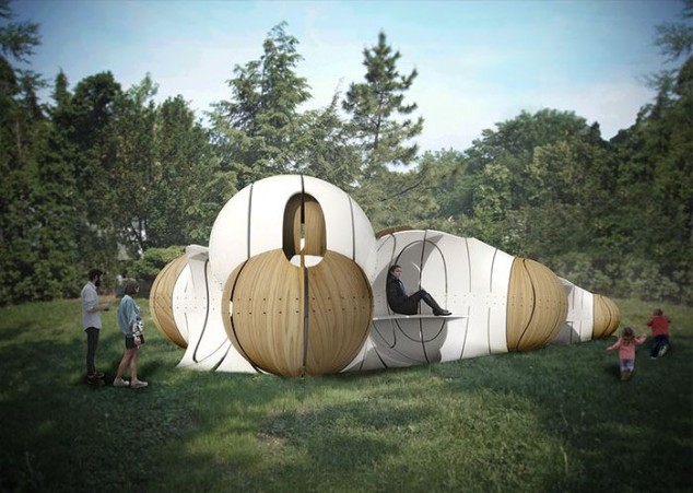 The Architectural League and Socrates Sculpture Park have selected Torqueing Spheres by Cambridge- and Philadelphia-based IK Studio as the winner of Folly 2015, which will be on view from 05.17.15 through 08.30.15 in Socrates Sculpture Park in Long Island City, Queens. Torqueing Spheres combines a simple concept – a straight line – with complex spherical pods that become deep, self-supporting chambers to create experiences for both the collective and the individual. A cost-effective method of bending plywood while maintaining a system of control and delivery is being implemented to construct the voluminous curves. By blending folly formalism with innovative material techniques, the project plays off of traditional architectural geometries to create new construction spaces that allow for exploration. The Folly Program is an annual competition launched in 2012 that challenges emerging architects to design and build a large-scale project for public exhibition at Socrates.