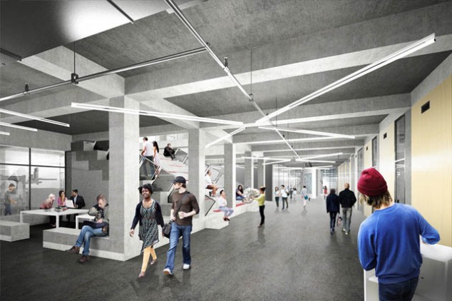 Currently under construction is the transformation of an existing industrial building into the new three-story, 58,000-square-foot Pennovation Center at the University of Pennsylvania in Philadelphia. Designed by HWKN, the building, just south of the main campus, features a faceted façade on one side, and contains an array of interior spaces calibrated for both private and collaborative activity, including co-working desk space, meeting rooms, wet and dry labs, social spaces, and a central bleacher for presentations from start-ups to potential investors. A series of garage doors opens directly to ground-floor studio spaces, which is a nod to the many tech companies that began life out of a home garage. The third floor houses an environment designed to promote fundamental research and accelerate the lab-to-market technology transfer pipeline in robotics, the Internet of things, and embedded systems. A plaza and landscape will incorporate green infrastructure. Within the landscape is an instrumented, outdoor laboratory that enables the validation of high-performance outdoor aerial and ground robots. The design team includes KSS Architects, Land Collective, Bruce Mau Design, Ballinger, Focus Lighting, and Atelier Ten. The center is scheduled to open in the summer of 2016.