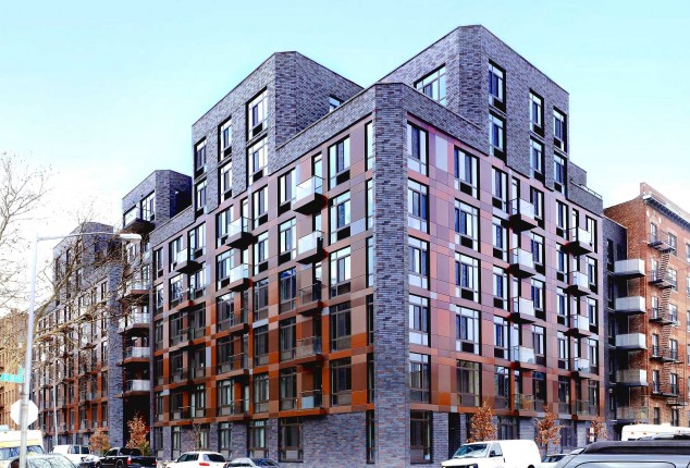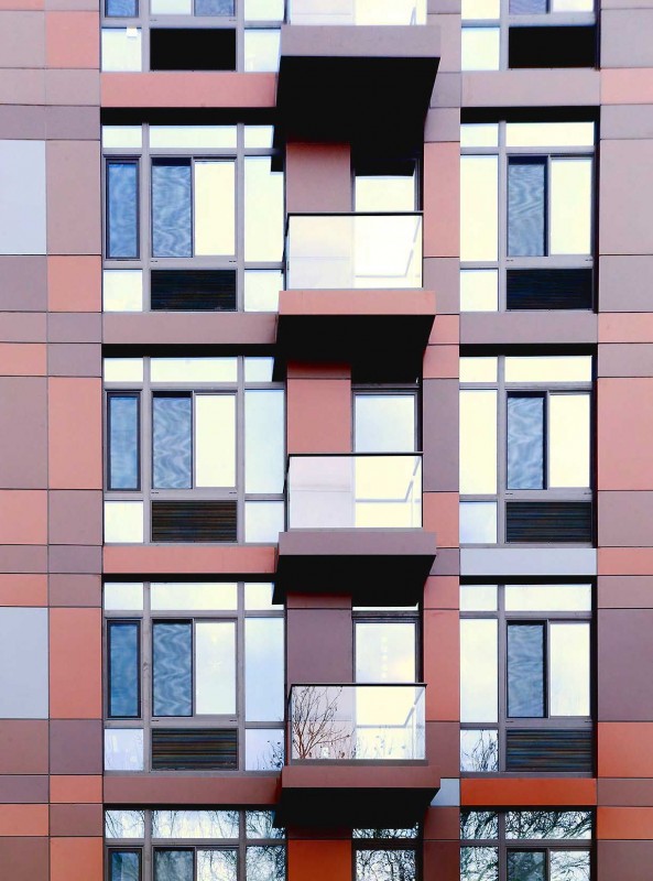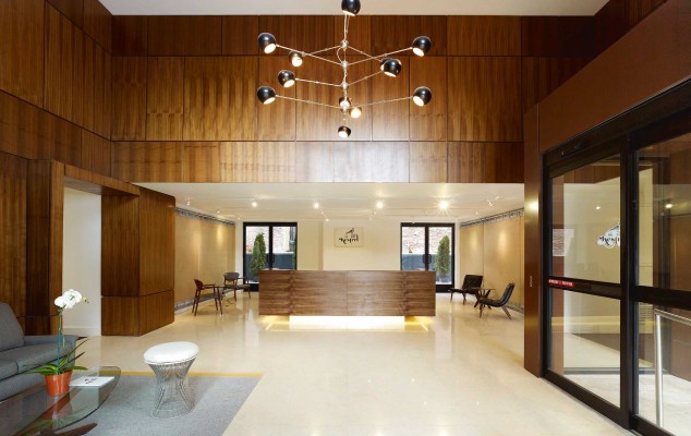 For eight years, 33 Caton Place in the Windsor Terrace section of Brooklyn was just a dormant, concrete shell, but after recent finishing touches, the project have been completed and inhabited. Designed by Luca Andrisani Architects, the 206,000-square-foot project, known as Kestrel, contains 126 rental units composed of studios to three-bedroom apartments ranging from 700 to 3,000 square feet. Many of the units have private terraces, some of which overlook Prospect Park. In order to blend in with its brownstone neighbors, the design sought to dematerialize the building’s mass. To that end, the façade is clad in hundreds of earth-toned metal panels of different sizes, shapes, and colors that create a visually intricate and complex exterior. Dark Iron spot masonry in grays and browns frames metal portions around the top, sides, and ground floor of the building. In the interior, metal wraps into the lobby vestibule and transitions to a double-height walnut paneled entry. Glass at the rear lobby wall reveals a courtyard garden; framing this view are the two sides of the inner lobby clad in gold-toned metal mesh. Amenities include a landscaped rooftop, a resident lounge, children’s playroom, fitness center, yoga room, lounge and media room, and a work-from-home office center. DJ Associates served as architect-of-record.