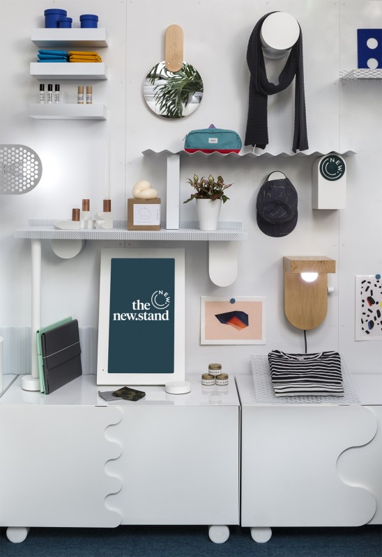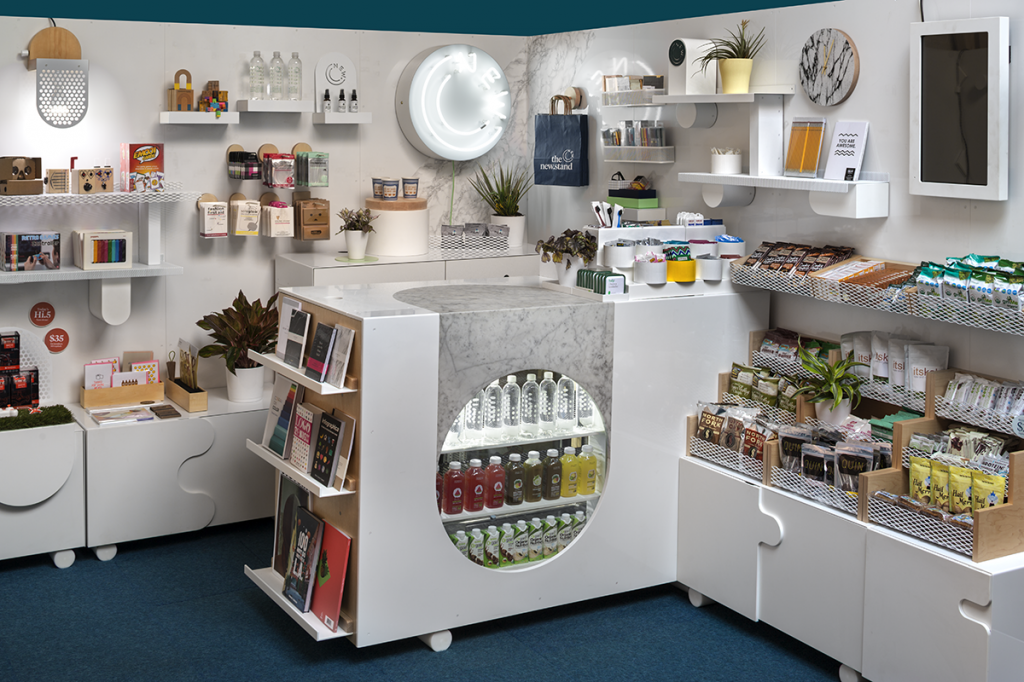 Whether it’s a bottle of water, kale chips, or a collapsible bike helmet, the New Stand (aka newstand), located in the Union Square subway station near the entrance to the L train, packs a multitude of products in a mere 200 square feet of space. Furniture designer François Chambard of Brooklyn-based UM Project collaborated with the company’s in-house design team on the store’s concept and intent. He fabricated a series of modular floor and wall units using a simple material palette. The Corian-clad floor-standing cash wrap and storage have sliding “feet” so they are easy to move and stack. Doors on the storage units are different and create a variety of functional patterns depending on their configurations. Smaller pieces designed for the wall are magnetic and can be placed anywhere on white, powder-coated steel wall panels. Round magnetic pedestals and display forms are mounted atop the low storage pieces to create a playful display system. Flat shelves made of powder-coated, white corrugated metal, perforated metal, or metal mesh feature small magnetic blocks crafted in various shapes and sizes. Because the existing fluorescent light fixtures could not be removed, per MTA rules, the team covered them with custom-bent, perforated, powder-coated steel covers that create a moiré effect. Maplewood light fixtures with shapes that match other store components feature programmable and interconnected LEDs that can be timed, dimmed, synchronized, and change colors. The architect-of-record is Zachary Gidich Architecture & Design. The company recently opened a kiosk at the Winter Garden in Brookfield Place, and a third is planned for the 47th-50th Rockefeller Center station.