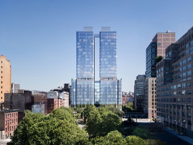 Designed by Renzo Piano Building Workshop, the two low-iron, glass-clad, 30-story towers at 565 Broome SoHo (formerly known as 100 Varick) are on the rise in Hudson Square..Curved-glass corners of the 115 condo residences and the amenity spaces are void of mullions, allowing for clear, crisp views. The units average 2,100 square feet and range from studios to four bedrooms, with a mix of duplexes, full-floor apartments, and penthouses. A select number of units feature private terraces with a 25-foot a saltwater pool and outdoor living rooms. The first two floors include approximately 16,800 square feet of retail and commercial space. The project boasts 17,000 square feet of a gated motor court, a 55-foot saltwater lap pool, a fitness center and yoga studio, sauna and steam room facilities, a media room, a landscaped outdoor terrace, and a children’s playroom. There will also be a 90-foot-tall, landscaped lounge and conservatory with a library and wet bar. The firm’s first residential project in New York City is expected to be completed in 2018. SLCE Architects serves as the architect-of-record and interior design is by Paris-based RDAI Architecture. The project is being developed by Bizzi & Partners Development, Aronov Development, and Halpern Real Estate Ventures.