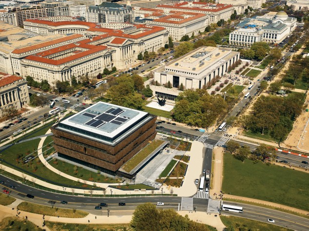 More than 100 years after it was originally proposed by black veterans of the Civil War, the newly opened Smithsonian National Museum of African American History and Culture, designed by the team of Freelon Adjaye Bond | SmithGroupJJR, takes its place across from the Washington Monument on the National Mall. From one perspective, the building’s architecture follows classical Greco-Roman form in its use of a base and shaft, topped by a capital or corona. In this case, the corona is inspired by the three-tiered crown used in West Africa. The building’s main entrance is a welcoming porch, which has architectural roots in Africa and throughout the African Diaspora, especially in the American South and Caribbean. Finally, the ornamental bronze-colored metal lattice that wraps the entire building, pays homage to the intricate ironwork that was crafted by enslaved people in South Carolina and Louisiana. The enveloping lattice on this 400,000-square-foot building also opens it to exterior daylight, which can be modulated according to the season. The museum contains several levels and 35,000 artifacts from around the world. The design team consists of lead designer Adjaye Associates; lead architect, architect-of-record, and project manager The Freelon Group (Perkins+Will); associate design/construction architect SmithGroupJJR; landscape architect Gustafson Guthrie Nichol; exhibit designer Ralph Applelbaum; and Davis Brody Bond, founding member of the design team. Prior to the design competition for the museum, Davis Brody Bond established the Master Facility Planning and Program Study for the NMAAHC in collaboration with The Freelon Group (which became part of Perkins+Will in 2014), that was completed in 2008 and became the criteria for the design. The firm’s late partner J. Max Bond, Jr., FAIA, worked closely with museum leadership and was instrumental in realizing the design criteria.