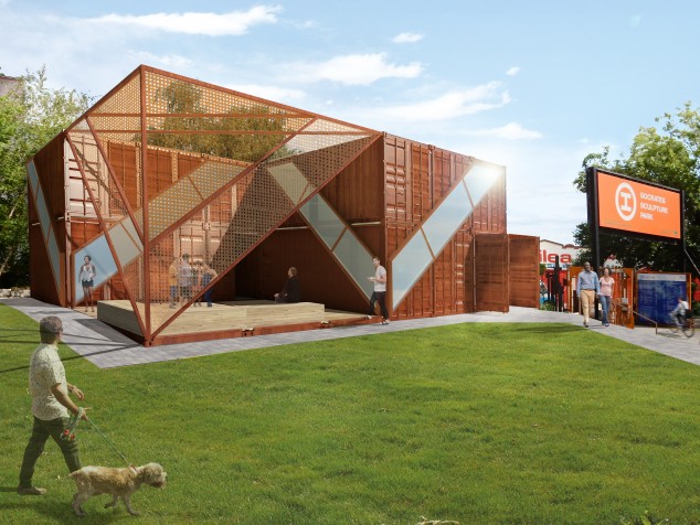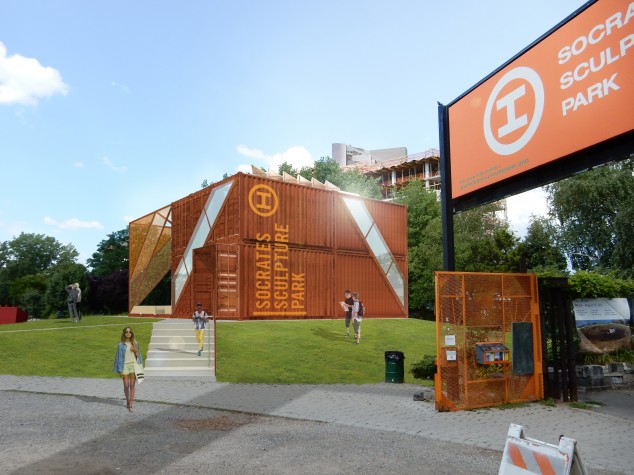 Socrates Sculpture Park on the Queens waterfront, and the NYC Department of Parks and Recreation recently released images of “The Cubes,” a new 2,640-square-foot, two-story building that will become the first permanent indoor home for the sculpture park in its 30-year history. Designed by LOT-EK, the building provides 960 square feet of flexible, multi-purpose space to house indoor education programming for classes, 1,200 square feet of permanent office and administration space, and a 480-square-foot shaded deck for outdoor classes and programming. The building originally began as a 720-square-foot structure composed of six shipping containers commissioned by the Whitney Museum of American Art to house the museum’s education programs. When the Whitney offered the structure as a donation to Socrates Sculpture Park, the concept expanded and evolved by adding 12 additional shipping containers, for a total of 18 stacked on two levels to form a singular structure. Diagonal, continuous bands of glass along the sides and roof provide natural light and transparency, offering visitors inside a view of the landscape and skyline outside, and park visitors a view of activities inside. Since its inceptions, the park has presented outdoor artworks by more than 1,000 artists, developed an educational program that serves more than 10,000 youth annually, and presents a full range of public programs.