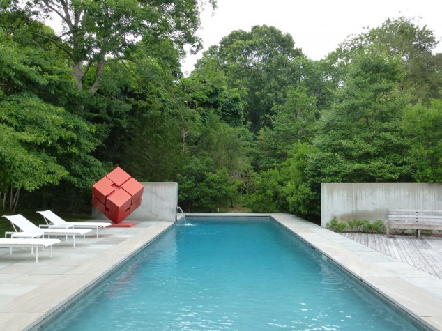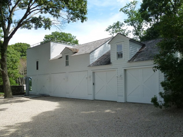 The project is a study in balance, from the veiled entry to the dock that opens onto an egret preserve. Mindel mediated large-scale influences – the grid of the street giving way to the waterfront – to inform the geometry of the site planning and house. Passing through the security gate, one enters a gravel forecourt, mimicking the North Sea Harbor on the site’s opposite side. Landscaping by Rumsey Farber reinforces the nearby nature preserve while mapping out level changes and geometry with stone walls. Between these two poles lie the composition of house and pool house and the “pool of grass and the pool of water,” as Mindel describes the open spaces. The pool house appears traditional, but a closer look reveals the progression from a low façade with a full gable dormer, to a dormer half buried in the façade, to a window in a modern cube. This play on form, tradition, and history runs through the project.
