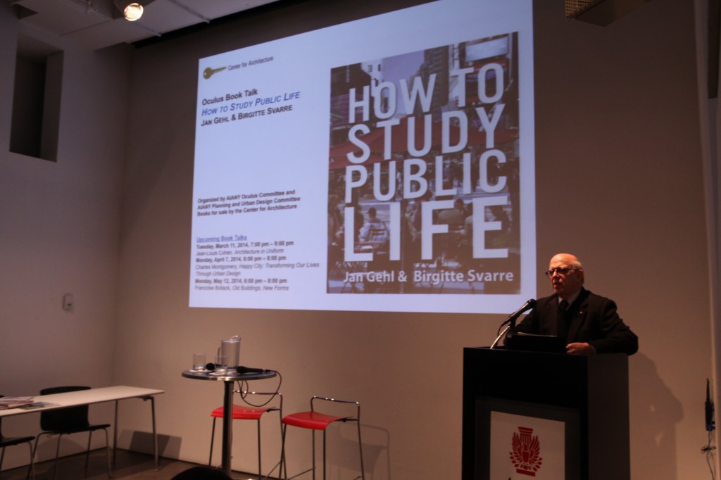 The Center for Architecture hosted authors Jan Gehl and Birgitte Svarre at the 02.05.14 Oculus Book Talk, co-sponsored by the AIANY Planning & Urban Design Committee. AIANY 2014 President Lance Jay Brown, FAIA, pronounced Gehl as “my hero” and a “kindred spirit” laying the ground work for a warm and delightful evening.