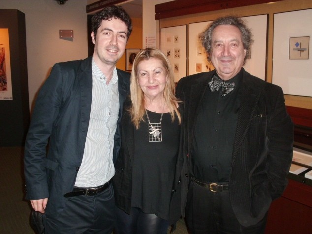 On view through 07.30.13: (l-r) Roman Khidekel, Dr. Regina Khidelkel, and Mark Khidekel at the “Floating Worlds and Future Cities” exhibition of Russian Suprematist architect Lazar Khidekel at the YIVO Institute Gallery, 15 West 16th Street.