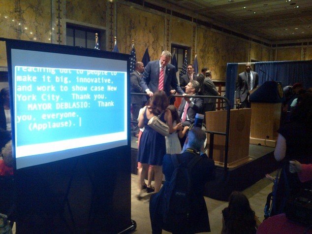 Noting that there were nearly one million New Yorkers with disabilities, the mayor said that his administration had recently passed a rent increase exemption, known as the Disability Rent Increase Exemption, or DRIE for short. It established a revised income ceiling that has allowed at least 3,000 more families to afford decent housing. Among other specifics, he added that half of New York City’s yellow cabs will be accessible by the year 2020, noting that “this would be a difference-maker” since New York, as the biggest city in the country, was creating “an accessible, equal-opportunity life for those with disabilities.” He stressed that changes made in New York City serve as a powerful model for other cities, and joked that he had recently heard a song about New York – pausing for impact – “that says if you can make it here you can make it anywhere.”