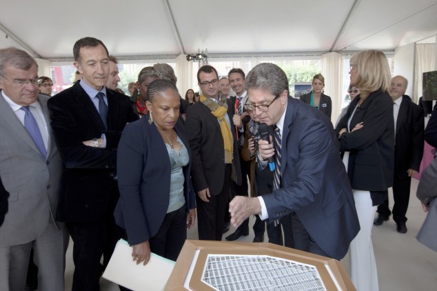 07.09.2013: French Minister of Justice Christiane Taubira and James von Klemperer, FAIA, Design Principal at Kohn Pedersen Fox Associates stand over a model of the office building PDM 3 at its groundbreaking ceremony at the Parc du Millénaire in Paris.