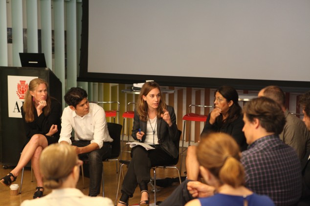 07.02.13: Speakers and audience members join in a conversation moderated by Gwenaëlle de Kerret to talk about the competition of the Albums des Jeunes Architectes et Paysagistes, which aims to promote architectural and landscaping culture in France, at a breakfast discussion “French & American Perspectives” before the exhibition opening.