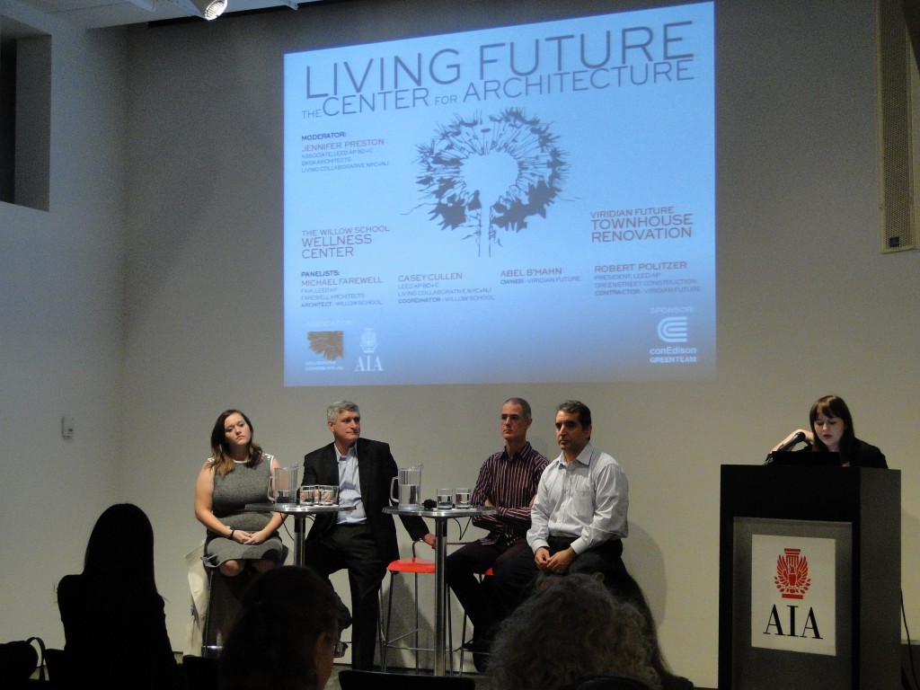 11.18.13: The Living Building Challenge was discussed by a panel organized by AIANY’s Committee on the Environment. (l-r) Casey Cullen, LEED AP BD+C, Co-Founder, Living Collaborative NYC+NJ; Michael Farewell, FAIA, LEED AP, Principal, Farewell Architects; Abel B’Hahn, Owner, Viridian Future; and Robert Politzer, LEED AP, President, Greenstreet Construction; and moderator Jennifer Preston, LEED AP BD+C, Associate Sustainable Design Director, BKSK Architects and Co-founder, Living Collaborative NYC+NJ.