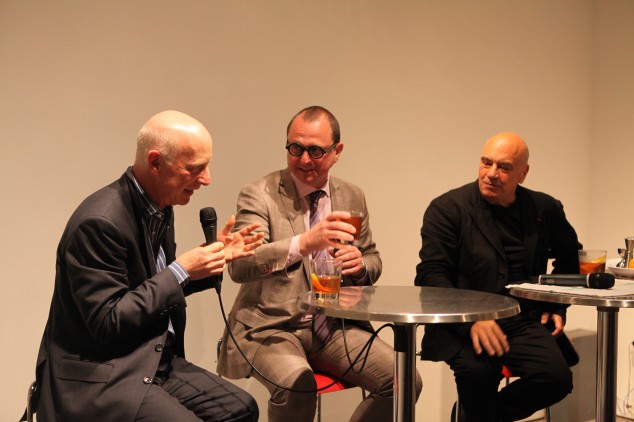 05.16.14: Architecture critic Paul Goldberger, Hon. AIA; Gregg Pasquarelli, AIA, principal at SHoP; and Massimiliano Fuksas, Hon. FAIA, co-founder of Studio Fuksas talked architecture while sipping on bourbon-based drinks by Tony Cecchini.