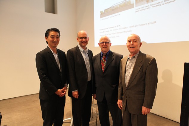 05.21.14: (l-r) Ung-Joo Scott Lee, project manager at Morphosis, and Christopher McCready, AIA, co-director of SOM Education, Health and Science, participated in a talk on Net Zero Energy educational buildings in New York, introduced by AIANY 2014 President Lance Jay Brown, FAIA, and moderated by AIANY Architecture for Education Committee Co-chair Umberto Dindo, FAIA.