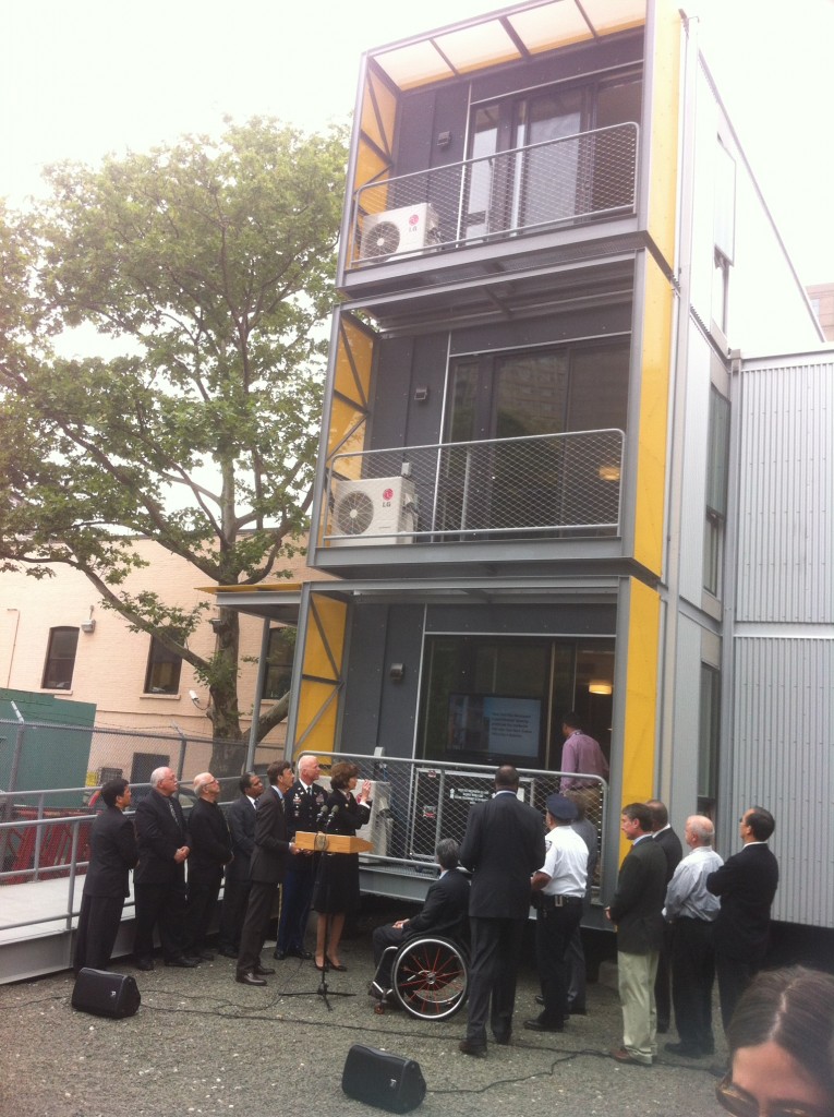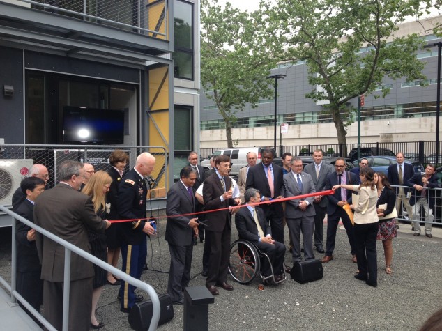 06.10.14: Government officials, including Colonel Paul E. Owen, Commander and District Engineer of New York District; NYC Department of Design + Construction Commissioner Feniosky A. Peña-Mora; NYC Office of Emergency Management Commissioner Joseph Bruno; NYC Mayor’s Office for People with Disabilities Commissioner Victor Calise; Regional Administrator of FEMA Region II Jerome Hatfield; and Thaddeus Pawlowski, Planning Advisor to the Mayor’s Office of Housing Recovery Operations, attended the ribbon cutting ceremony for Garrison Architects’ Post-Disaster Urban Interim Housing Prototypes.