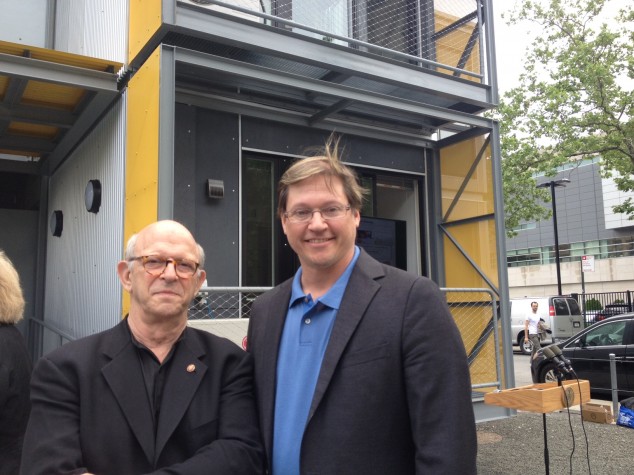 06.10.14: AIANY Design for Risk and Reconstruction Committee founding co-chairs Lance Jay Brown, FAIA, AIANY 2014 President, and Illya Azaroff, AIA, celebrated the Post-Disaster Urban Interim Housing Prototypes by Garrison Architects at the ribbon cutting ceremony.