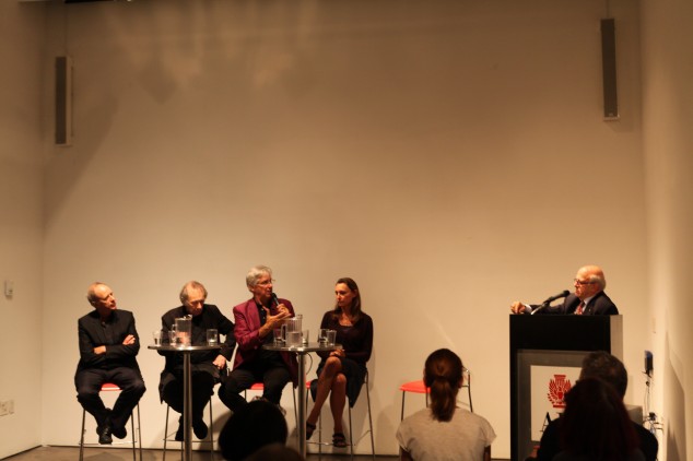 09.08.14: Bill Buchen, founder of Sonic Architecture; Vito Acconci designer, landscape architect, and performance and installation artist, Christopher Janney, composer, artist, and architect at PhenomenArts; and artist Monica Banks participated in the panel discussion “Artists and the City,” moderated by AIANY 2014 President Lance Jay Brown, FAIA. Credit: Carlos Solis-Keyser