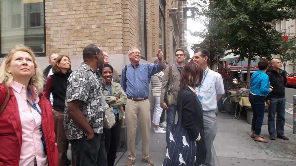 09.13.14: Kyle Johnson, AIA, led participants including former Center for Architecture president Roberta Washington, FAIA, on a tour of SoHo, organized by the AIANY Architecture Tour Committee. Credit: Rick Bell