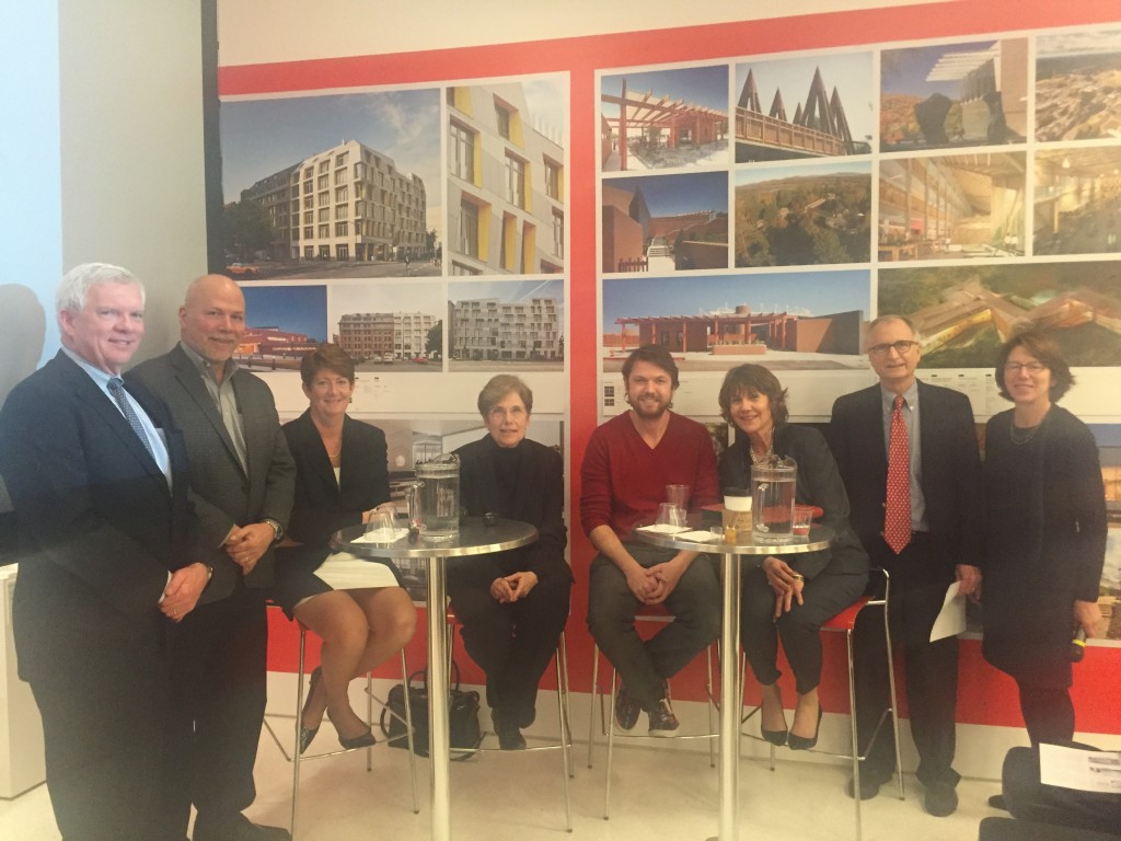03.01.16: AIANY Science & Research Facilities brought together New York-based biotechnology scientists to discuss bringing more companies to our city. (l-r) Jim Berge, AIA, and Paul Drago, Co-chairs, AIANY Science & Research Facilities Committee; Leslie Whatley, Executive Director, START-UP NY; Eva Cramer, Ph.D., Distinguished Service Professor of Cell Biology, Vice-President for Biotechnology and Scientific Affairs, SUNY Downstate Medical Center and Incubator, and President, Downstate Technology Center, Inc. and BioBAT, Inc.; Michael Lamprecht, Research Scientist, Epibone, Inc.; Kathleen Otto, Executive Director, BioBAT, Inc; Hank Abernathy, AIA, Co-chair, AIANY Science & Research Facilities Committee; Carol Loewenson, FAIA, 2016 AIANY President.