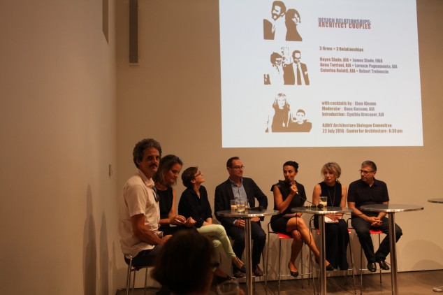 07.22.16: At “Design Relationships: Architect Couples,” architects discussed the challenges of finding a design voice while developing a long-term relationship. (l-r) James Slade, FAIA, and Hayes Slade, AIA, Slade Architecture; Anna Torriani, AIA, and Lorenzo Pagnamenta, AIA, APT Architecture; Hana Kassem, AIA, Director, KPF; and Caterina Roiatti, AIA, and Robert Traboscia, TRA Studio.